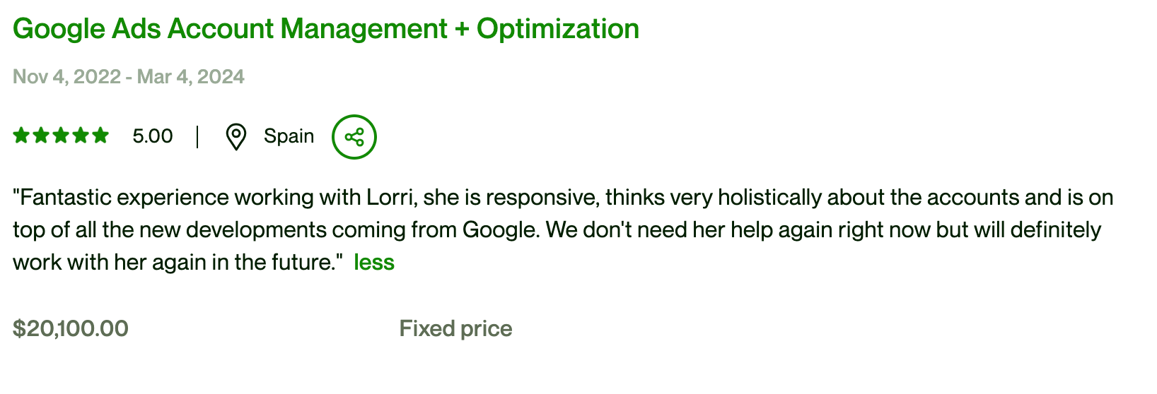At the end of the day, the individual you hire and choose to assist in growing your business must be accountable and transparent. I treat every dollar spent and every strategy developed as if they were my own. All contracts are set with a minimum of 90 days, not annual commitments, allowing you to witness and believe in our progress before deciding on a long-term commitment. My goal is to build partnerships where we both are excited about the growth, and you choose to work with me well beyond the initial 90 days. This isn't because you're locked into a contract, but because of the tangible value I bring to the table.